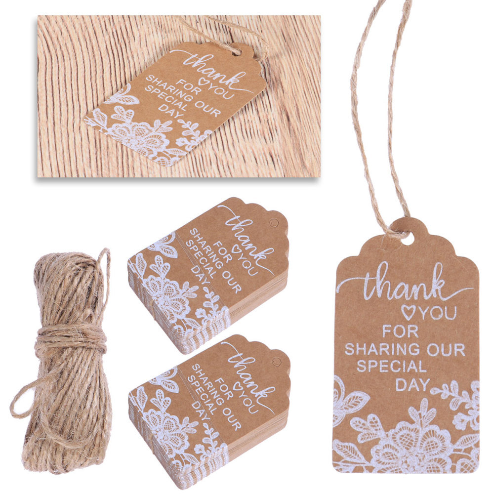 50Pcs Kraft Paper Tags Gift Tags White Lace Print Tag with Hemp Rope